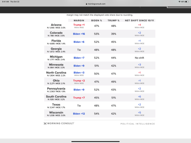 North Carolina, same. I heard that North Carolina is allowed to start counting mail-in votes before Election Day, so the count can happen quickly. Wisconsin and Pennsylvania will be sloooowwww. | |||